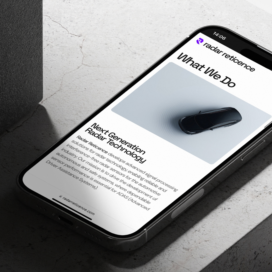 A visual identity and website created for a startup developing radar technology for the automotive industry. The design explores a tech-forward visual language that reflects innovation, precision, and the company’s ambition to become a strong player in the future of automotive technology.